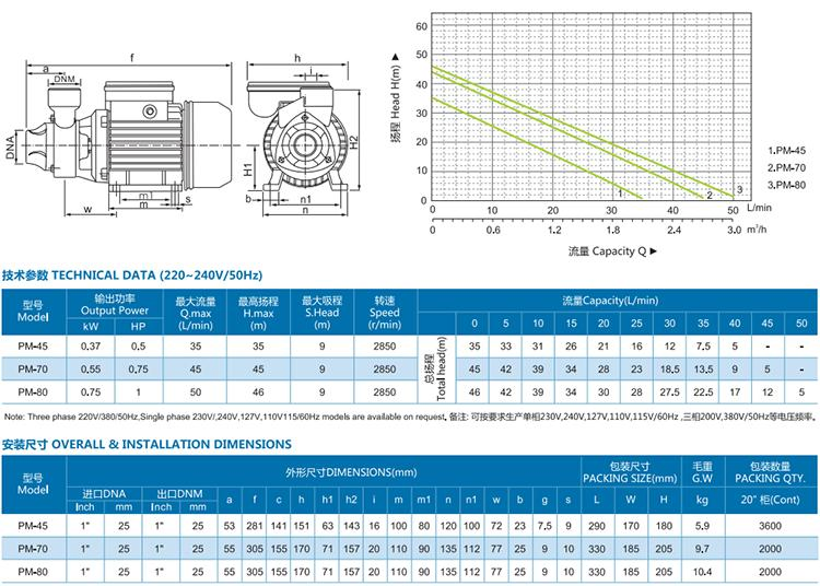 PM series water pumps are with peripheral impeller and small power, but they can supply high pressure with particularly steady operating curves. In order to ensure the pump function correctly, please use pumps to transfer clean water or non-aggressive liquid only, without sand or other solid impurities. They are suitable for domestic water supply, rise pressure of pipeline system and pump water automatically by high pressure tank and water unit
